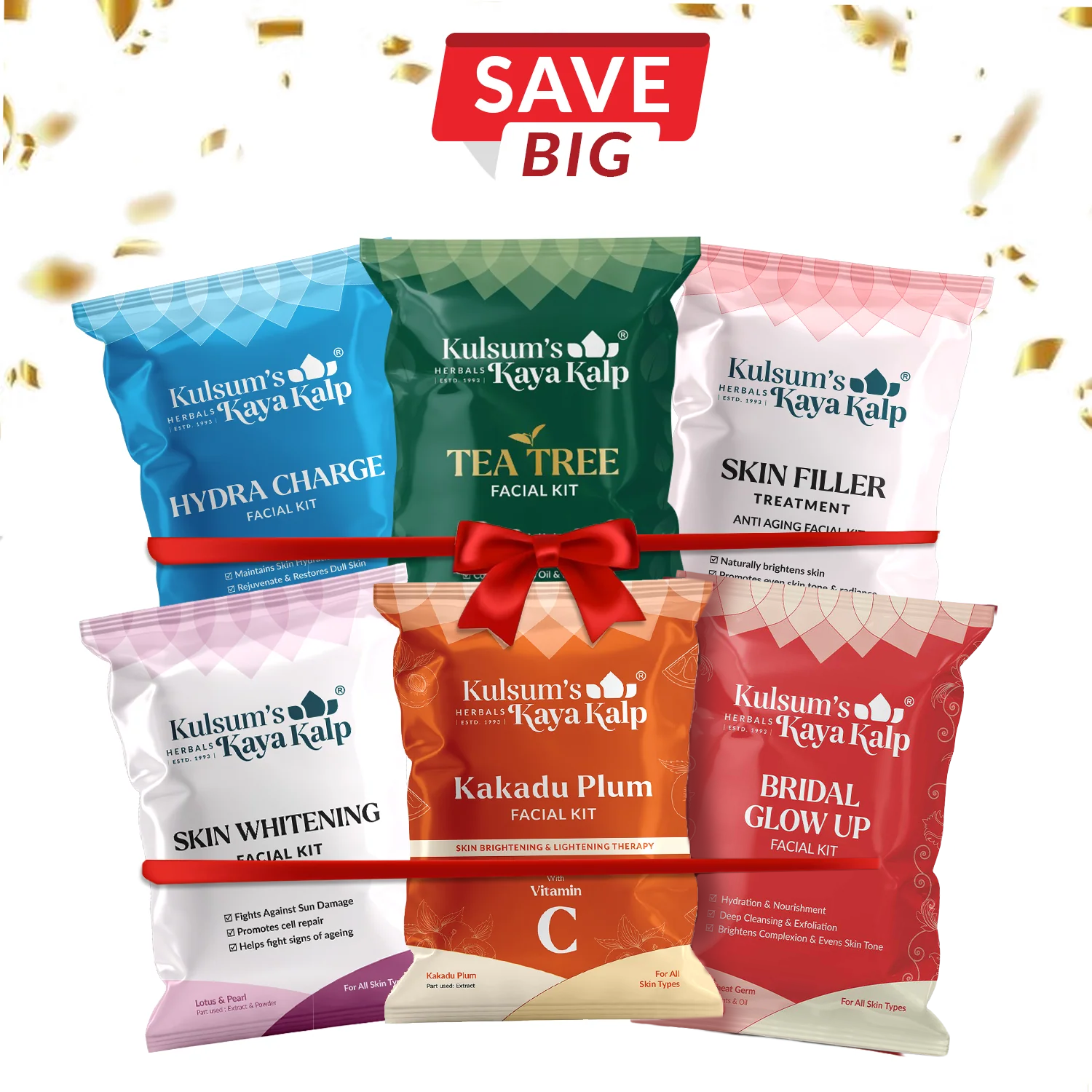 Give your skin the love it deserves with our Pack of 6 Facial Kits — a complete at-home skincare ritual to pamper, protect, and perfect your skin. This exclusive combo features six targeted facial kits designed to address every skin concern — from dullness and dryness to uneven tone and fine lines. The Kakadu Plum Facial Kit with Vitamin C brightens and firms, the Tea Tree Kit calms acne and controls oil, while the Hydra Charge Kit deeply hydrates for soft, plump skin. The Skin Filler Kit smoothens fine lines, the Skin Whitening Kit enhances radiance, and the Bridal Glow Up Kit delivers that luminous, occasion-ready glow.