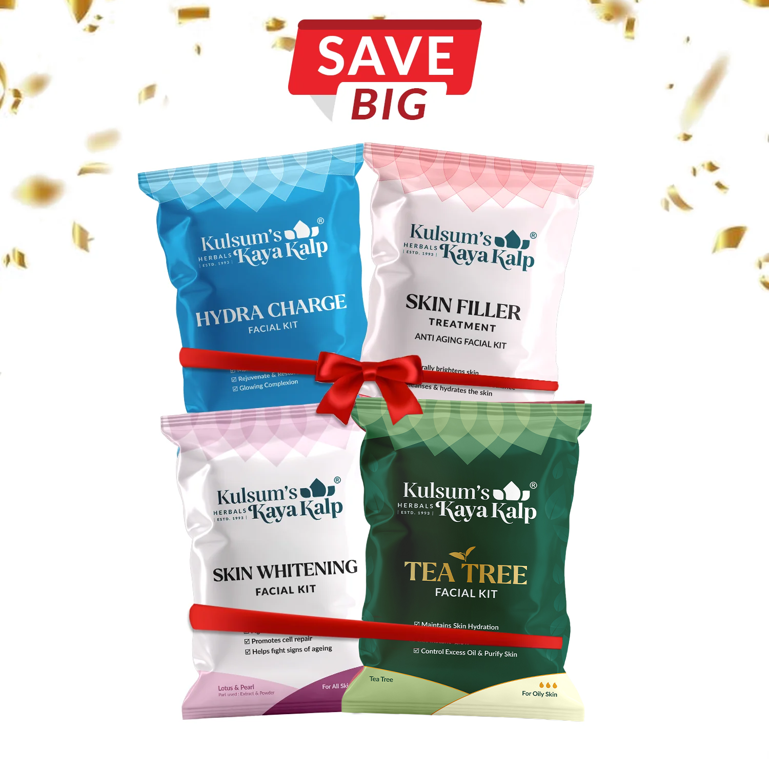 Pack of 4 Hydra Charge, Skin Filler, Skin Whitening, & Tea Tree Facial Kit- 7 in 1