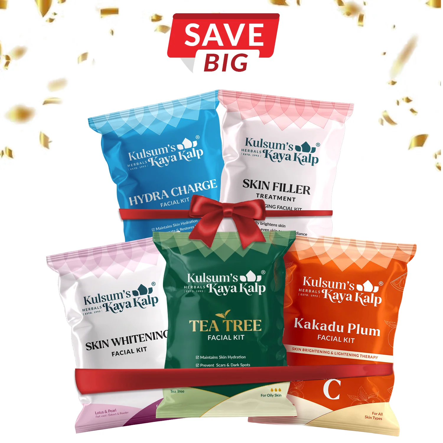Experience a high-end skincare ritual with our Pack of 5 Facial Kits—featuring Kakadu Plum with Vitamin C, Hydra Charge, Skin Filler, Skin Whitening, and Tea Tree. Specially curated for skincare enthusiasts, this exclusive bundle includes six of our best-selling facial kits to target a range of skin concerns—from hydration and brightening to rejuvenation and blemish control. Enjoy salon-like facials at home and achieve glowing, flawless skin with ease.