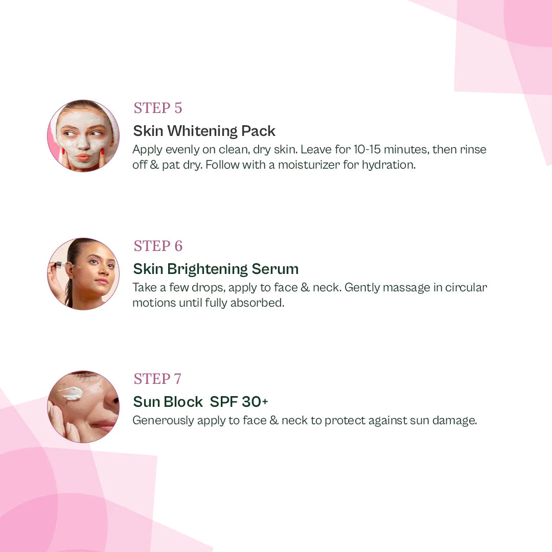 Step 5: On a clean and dry face, evenly apply the Skin Whitening Pack. Let it sit for 10-15 minutes, then wash and pat dry. Lock in the goodness with moisturizer or hydrating lotion.