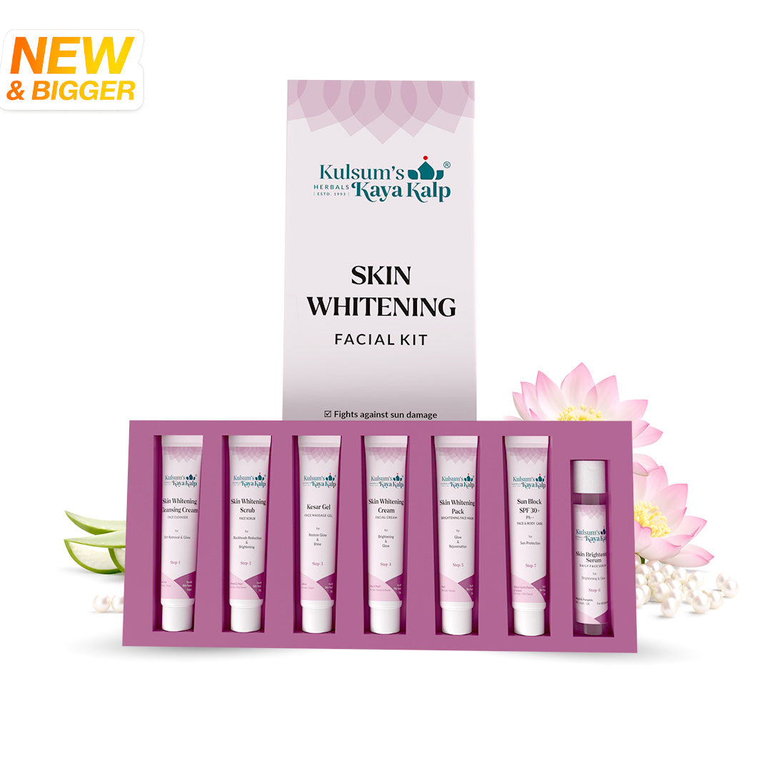 Getting the brightest skin is no longer a secret—all you need is Kulsum's Skin Whitening 7 in 1 Facial Kit. Unveil luminous, even-toned skin with Kulsum's Kaya Kalp Skin Whitening 7 in 1 Facial Kit. Each Step in this kit is designed to target dark spots, pigmentation, and dullness, leaving your skin radiant and evenly toned. Infused with natural ingredients like pearl powder, saffron, and licorice, this kit addresses pigmentation, dullness, and uneven skin tone, leaving your skin radiant and youthful.