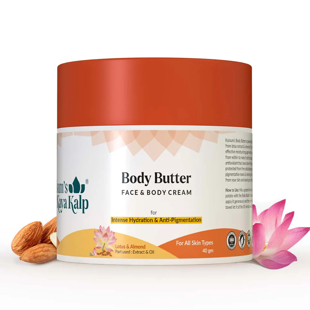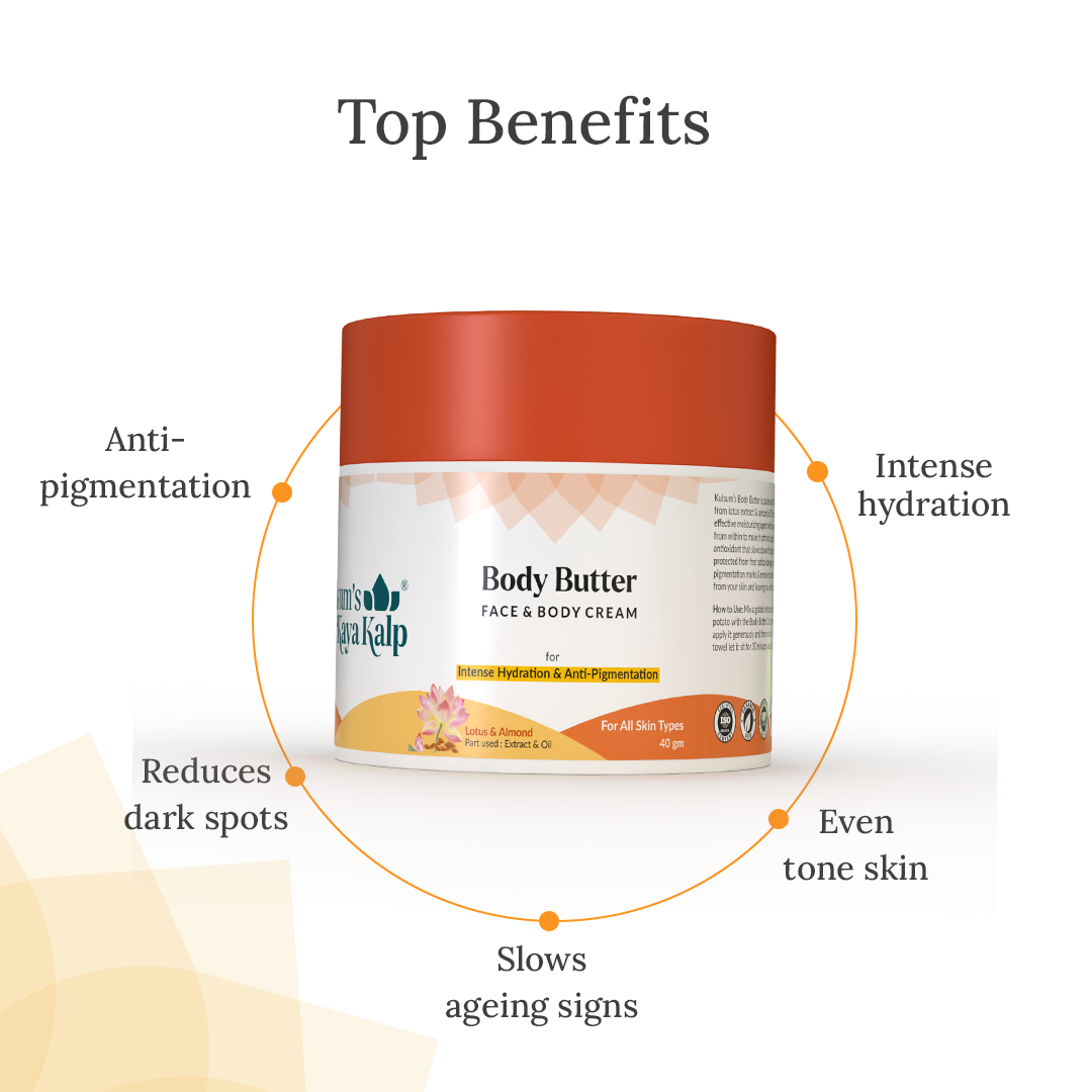 Dulge yourself in a velvety touch moisturizing body butter with Herbals Body Butter. It is made of rich ayurveda formula that leaves the skin deeply nourished and feeling soft. Packed with vitamins C, E and B from lotus extract & almond oil, the hydrating ingredients make it an effective body butter which nourishes the skin from within to make it soft and supple. Antioxidants help protect it from free radical damage, fade dark spots and provide a glow. This body butter is enriched with lotus extract, berberis aristata, sandalwood, almond oil, honey, and beeswax oil. Lotus extract contains skin-balancing properties and helps with sebum production in the body. Berberis aristata has anti-inflammatory properties to soothe the skin. Sandalwood and almond oil help nourish the skin, improve. Berberis aristata, sandalwood and almond oil help nourish the skin, improve the elasticity of skin cells, even out skin tone.