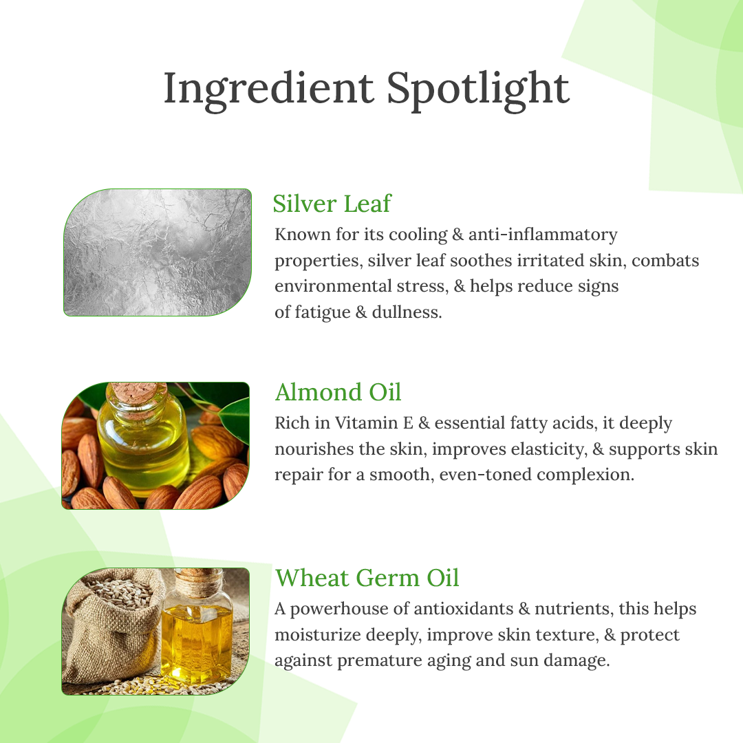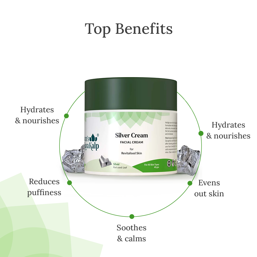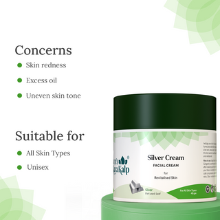 Indorcuing kulsum’s kaya kalp Silver facial cream whichis a luxurious facial cream designed to revitalize and rejuvenate your skin. This unique formula harnesses the power of nature's finest ingredients to address a variety of skin concerns, leaving your skin feeling soft, supple, and radiant.. The antimicrobial properties of silver help to combat acne-causing bacteria, while the soothing ingredients reduce inflammation and redness.The hydrating properties of wheat germ and almond oil deeply moisturize the skin, leaving it soft, supple, and healthy.